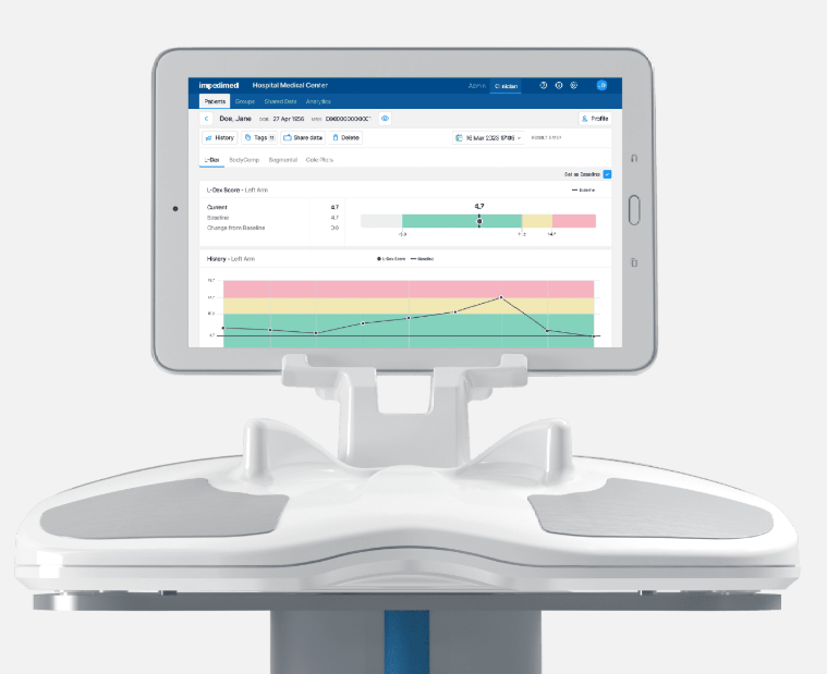 The SOZO® device by ImpediMed® - A device that uses patented bioimpedance spectroscopy technology to test fluid and tissue in the body (used to assess potential lymphoedema diagnosis). It provides a non-invasive way to determine body composition, including fluid levels, muscle mass, fat mass, protein, and minerals, and monitor changes over time to improve performance and health.